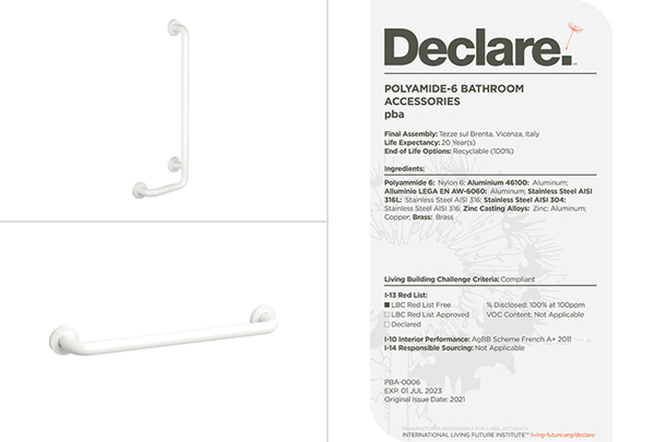 Tüm Programma 400-NY poliamid 6 tutunma barlarımız için, Declare “Red List Free” etiketi sunmaktan gurur duyuyoruz. Bu etiket, International Living Future Institute platformu üzerinden erişilebilir durumdadır.